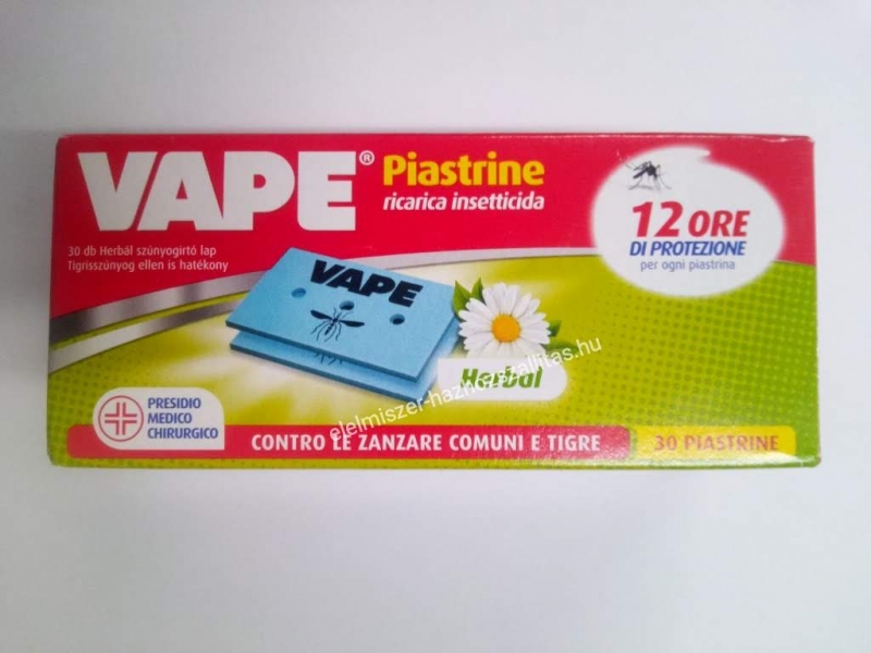 Vape rovarirtó lapka elektromos készülékbe 30 db. A Vape elektromos rovarirtó készülék egyaránt használható szúnyog és légyirtó lapkákhoz is. A szúnyogok és legyek irtására kifejlesztett készülék a csomagolásban található lapkákkal 30 éjszakán át nyújt védelmet. A lapka hatóanyaga: 12mg pralletrin/lap.